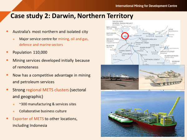 Examples of beneficiation are not limited to the developing world. In 2003, the Australian government sought to move up the extractive industry value chain to reduce commodity price volatility and over-dependence on exporting raw materials to China. The country took creative steps to bring diversity and high-value production into its mining states. One successful approach took advantage of mining industry clusters to create a Mining Equipment, Technology, and Services (METS) sector. The METS sector has grown into a major economic contributor to Australia, growing at double the rate of the mining sector and contributing an equal share of GDP by 2012.[13] See the tables below from the International Mining Development Centre/World Bank.