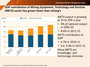 Examples of beneficiation are not limited to the developing world. In 2003, the Australian government sought to move up the extractive industry value chain to reduce commodity price volatility and over-dependence on exporting raw materials to China. The country took creative steps to bring diversity and high-value production into its mining states. One successful approach took advantage of mining industry clusters to create a Mining Equipment, Technology, and Services (METS) sector. The METS sector has grown into a major economic contributor to Australia, growing at double the rate of the mining sector and contributing an equal share of GDP by 2012.[13] See the tables below from the International Mining Development Centre/World Bank.